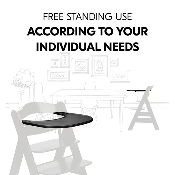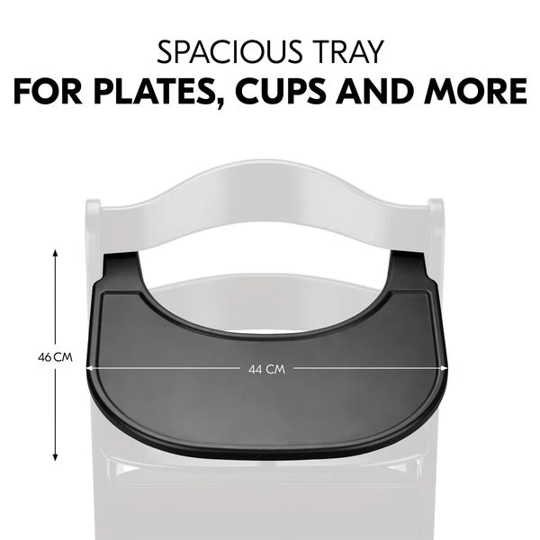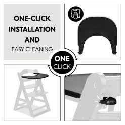 Dank robustem und widerstandsfähigem Material ist das Tablett am Kinderhochstuhl lange nutzbar. Der erhöhte Rand verhindert, dass Spielzeug einfach herunterfällt oder ausgeschüttete Getränke überlaufen. Zum Reinigen wischst du die glatte Oberfläche einfach mit einem Tuch und herkömmlichen Reinigungsmitteln sauber.