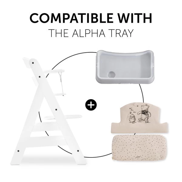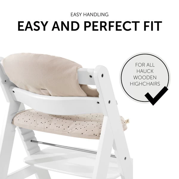 Das Design der Hochstuhlauflage ist für hauck Holzhochstühle entworfen worden. Die Auflage ist passgenau und wird durch Klettverschlüsse einfach und schnell befestigt. Das Highchair Pad ist mit dem Alpha Tray Tisch kompatibel – so können der separat erhältliche Tisch und die weich gepolsterte Auflage am Hochstuhl befestigt werden.