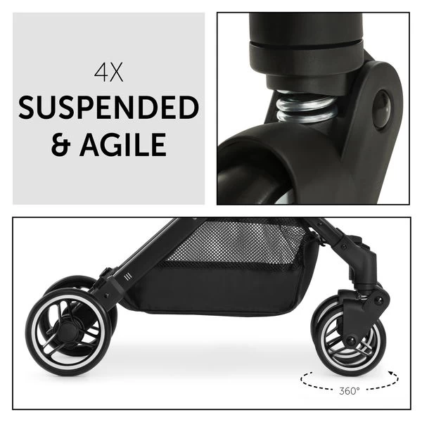 Mit 4-fach stoĂgedĂ€mpfter Federung und LeichtlaufrĂ€dern fĂ€hrt dein Kind immer sicher. Du meisterst jede Kurve dank der schwenkbaren 360-Grad-VorderrĂ€der. Zum Schlafen bringst du die RĂŒckenlehne mit einer Hand leicht in die Liegeposition. Das Sonnenverdeck mit Sichtfenster (UV-Faktor 50+) bietet Sonnenschutz und du hast dein Baby jederzeit im Blick.