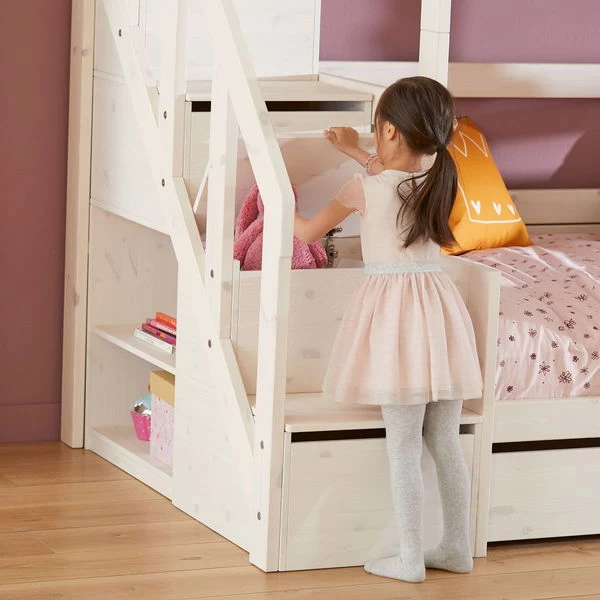 - Treppenmodul mit Geländer und Stauraum – die Treppenstufen bestehen aus praktischen Kisten mit einem Deckel (Softclose), seitlich sind in den Treppenblock Regalfächer eingelassen