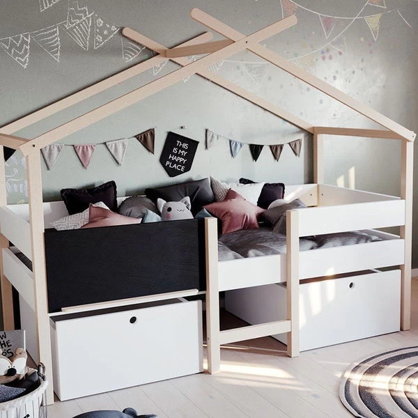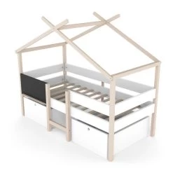 Das niedrige Hochbett, das ein Hingucker in jedem Kinderzimmer ist wird durch das Hausdach noch eindrucksvoller. Mit dem Rausfallschutz ist ein sicherer Schlaf auch für kleinere Kinder garantiert und die zwei Schubkästen helfen den Platz unter dem Bett ideal zu nutzen.