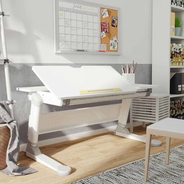 Der ergonomische Nature Kid Terra Schreibtisch ist besonders für Schulanfänger geeignet. Durch den großen Verstellbereich der Arbeitsplattenhöhe von 55 bis 75 cm wächst der Terra Schreibtisch von Anfang an mit Ihrem Kind mit. Auch die Ausstattung kann sich sehen lassen: die Arbeitsplatte ist dreigeteilt und der große, linke Teil lässt sich in mehreren Stufen schrägstellen und besitzt eine Dämpfung, damit sich die Platte beim verstellen langsam ansenkt. Die hintere und rechte Platte bleiben feststehend, hier können Stifte oder Papier liegen bleiben. Eine Schublade mit integrierter Stiftrinne sorgt für Ordnung und bietet viel Platz für alle Schreib- oder Malutensilien. An den vorderen Füßen des Terra Schreibtischs befinden sich Einsteller mit denen sich Bodenunebenheiten ausgleichen lassen.