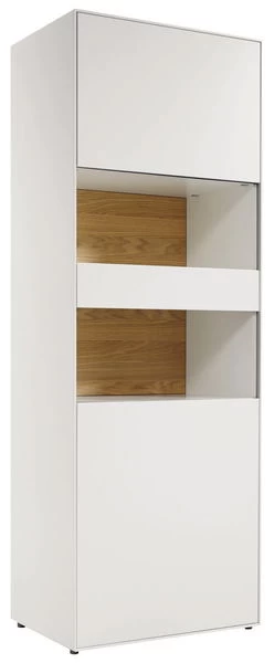 Der now! by hülsta easy Vitrine 10R A verfügt über 1 Tür hinter der sich 5 Fächer verbirgen, zwei davon hinter Glas. Die Standard-Rückwand der Vitrine ist in Lack-reinweiß zusätzlich wird eine Wende-Rückwand (eine Seite Lack-hellgrau, andere Seite Natureiche) mitgeliefert. Lieferung inkl. 1,5 cm hohen Stellfüßen.