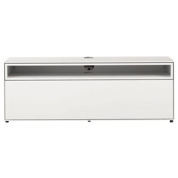 Das Media-Lowboard verfügt über 1 offenes Fach und 1 Klappe mit Kabelführungsmöglichkeit in Rückwand und Abdeckplatte.