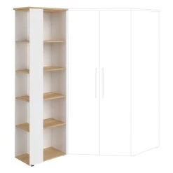 Das Paidi Oscar Eck-Regal kann einzeln aufgestellt werden oder an die schmale oder breite Seite des Oscar Eck-Kleiderschrankes angestellt werden. Der Aufbau ist spiegelverkehrt möglich. Die Deck- und Bodenplatte sowie die Regalböden bestehen aus Eiche-Nebraska-Nachbildung und der Korpus ist kreideweiß.