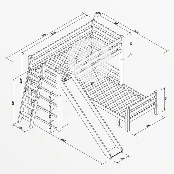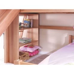 Das Relita SKY Etagenbett ist ein Qualitätsbett aus Massivholz zu einem erschwinglichen Preis. Das untere Bett ist im 90°-Winkel gedreht und schafft so Platz für das im Lieferumfang enthaltene Regal unter dem oberen Bett. Die schräge Leiter mit Grifflöchern ist an der Kopfseite angebracht und schafft so Platz für die Rutsche an der Längsseite. Bei Bedarf kann das Etagenbett zu zwei Einzelbetten umgebaut werden, zwei Rolllattenroste sind im Lieferumfang enthalten. Dank zahlreichem Zubehör in verschiedenen Farben kann das Relita SKY Etagenbett individuell ausgestattet werden.