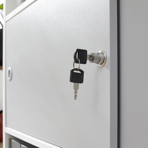 Die trendteam Basix Regal mit Schiebetüren ist eine stilsichere Lösung für Stauraum, ohne zu viel Stellfläche einzunehmen. Der Einsatz von Melamin schafft eine extrem langlebige Oberfläche. Dank der weißen Front- und Korpusgestaltung sowie der Absetzung aus Melamin wird das Design zum wahren Hingucker und passt sich erstklassig dem Raum an. Die farbliche Gestaltung wird durch die silberfarbenen Griffe komplettiert.